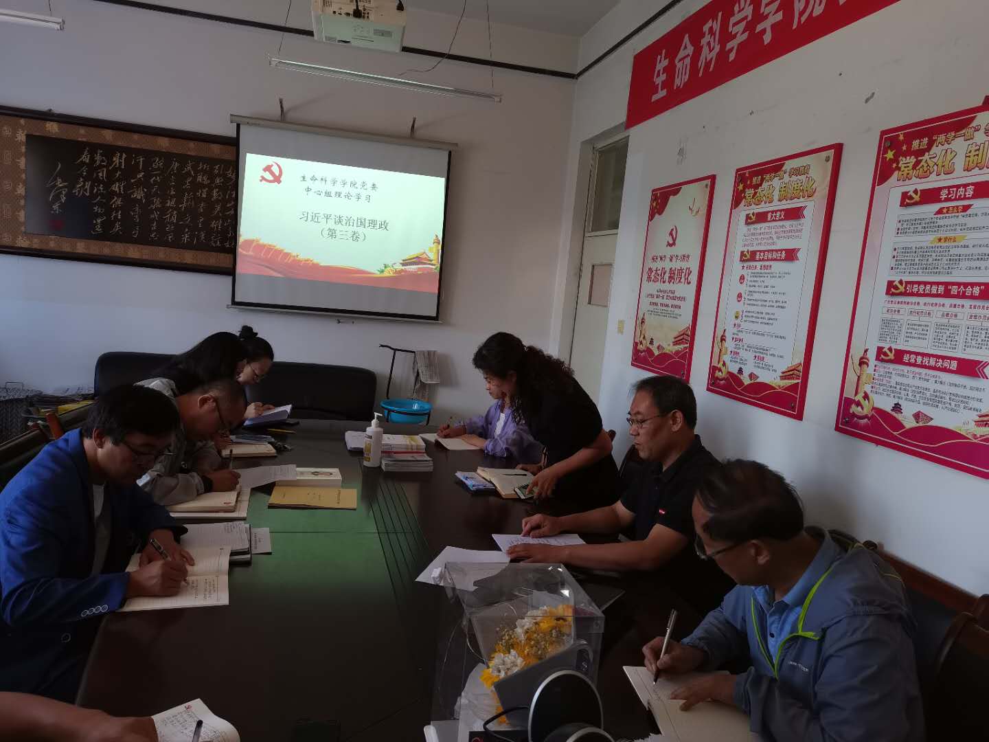 9月10日上午,生科学院党委中心组在博雅楼311会议室,专题学习《习近平谈治国理政》第三卷。学院党委副书记、院长王润梅主持学习,校讲师团王加力做学习辅导,生科学院党委中心组成员参加集体学习。