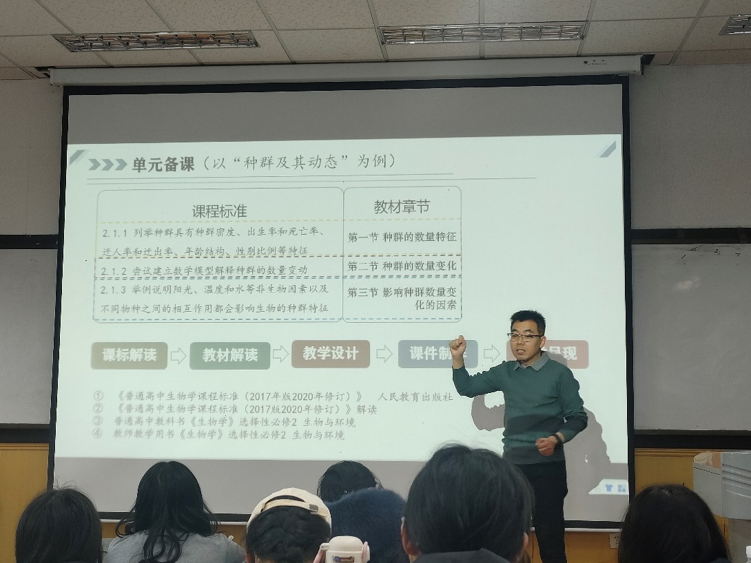 为使生物科学专业师范生深入领悟教育本质,提升教育教学能力,太阳成tyc7111cc集团邀请北师大大同附中邢立栋老师于12月13日下午在明哲楼201教室做了题为《基于真实情境的单元教学设计》——以种群及其动态为例的讲座。讲座由生物科学系曹慧芬老师主持,张红利系主任、张永芳老师和2022级生物科学专业全体学生参加。