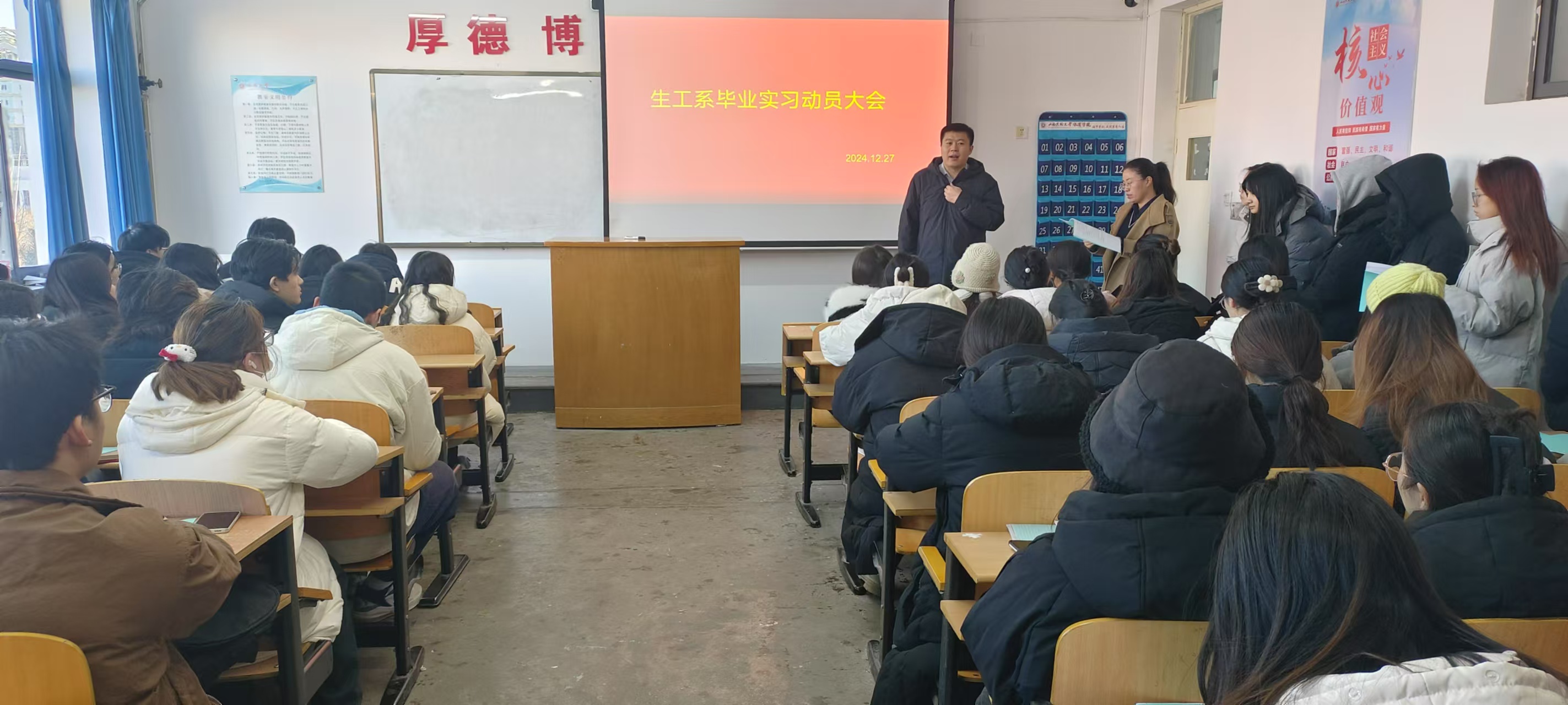 2024年12月27日上午,生物工程系在博雅楼310教室举行了生物工程专业毕业实习动员会。生物科学系主任张红利,生物工程系主任郭绪虎,以及实习相关教师和班主任出席会议。2021级生物工程专业全体学生参加会议。