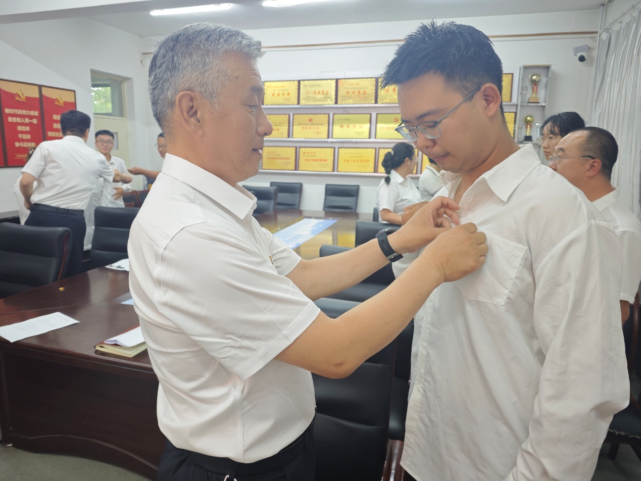 在随后举行的佩戴党徽环节中,老党员们郑重地为新党员逐一佩戴上崭新的党徽。这不仅仅是一个仪式,更是一种精神的传承。闪亮的党徽象征着沉甸甸的责任与担当,激励着新党员们时刻以党员标准严格要求自己。
