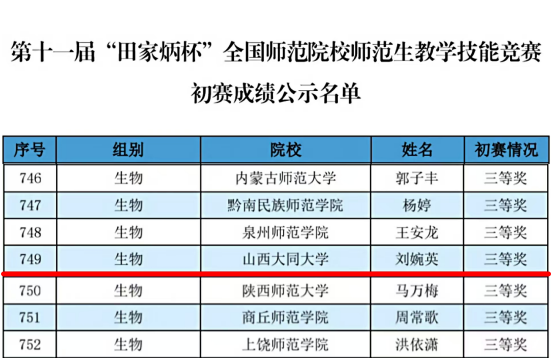 近日,全国师范院校师范生教学技能竞赛组委会发布第十一届“田家炳杯”全国师范院校师范生教学技能竞赛初赛成绩公示名单,我校太阳成tyc7111cc集团2023级生物科学专业刘婉英同学,在高中生物组竞赛中斩获三等奖。