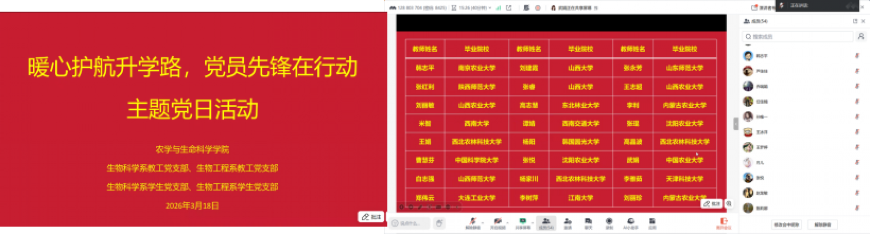 本次活动采用线上形式进行,以对话方式围绕升学之路展开深入交流。来自两个教工支部的24位教师、6位2021级优秀校友代表以及部分通过2026年研究生初试分数线的同学们齐聚云端。活动现场气氛热烈,同学们踊跃提出在复试准备、院校选择、调剂技巧、科研规划等方面遇到的困惑与问题,与会教师和优秀校友代表则结合自身丰富的经验和亲身经历,耐心细致地一一解答,提供了极具针对性和实用性的指导建议。